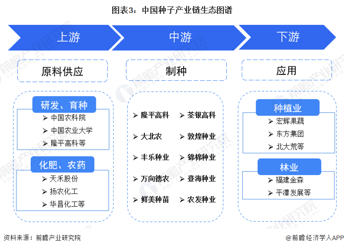 种子行业上游种子研发机构包括中国农业大学、中国农业科学院、隆平高科等;中游种子生产企业主要包括隆平高科、登海种业、丰乐种业、万向德农、荃银高科等;下游种植业企业主要包括东方集团、宏辉果蔬等,林业企业包括福建金森、平潭发展等。