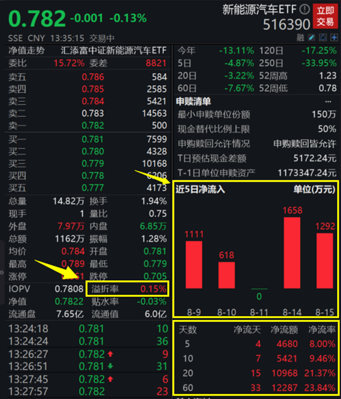 数据显示,在产业高景气度和估值持续回调的背景下,新能源汽车ETF(516390)近期大获资金青睐!上交所权威数据显示,截至8月15日最新数据,新能源汽车ETF(516390)近5个交易日获资金增仓累计超4600万元;近5日、10日、20日、60日均呈资金净流入态势,近60日累计获资金增仓超1.2亿元,资金净流入率高达23.84%!