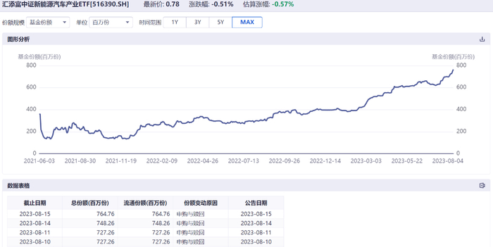 值得注意的是,截至8月15日,新能源汽车ETF(516390)基金份额再度创出上市以来新高!最新基金份额已上升至7.64亿份!