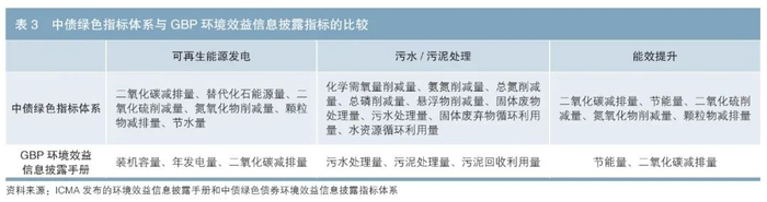 以中央国债登记结算有限责任公司编制的《中债绿色债券环境效益信息披露指标体系》(以下简称“中债绿色指标体系”)为例,该指标体系对207个行业制定了42个环境效益指标,是国内首次依据新版《绿债目录》对细分行业制定的定量分析指标体系。笔者将中债绿色指标体系与GBP的环境效益信息披露手册2进行了比较,对可再生能源发电、污水/污泥处理和能效提升3类绿色项目需要披露的环境效益指标进行具体分析(见表3)。