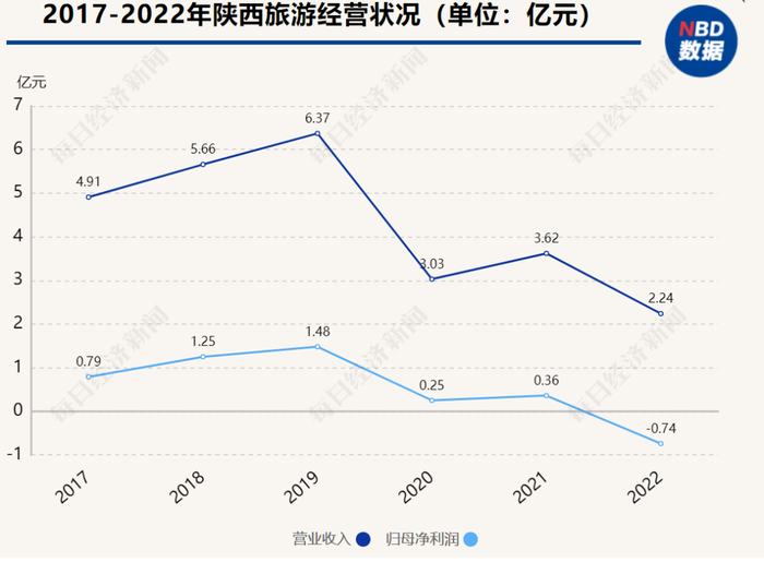业绩层面,2020年至2022年,陕西旅游的营收分别为3.03亿元、3.62亿元及2.24亿元,对应归母净利润分别为0.25亿元、0.36亿元、-0.74亿元。前两年勉强支持,2022年出现大幅亏损。