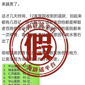 经核查,数据源头是人民日报健康客户端于4月份发布的文章《中国医院2023年收入预算前100公布》。该名单依据是全国各级政府部门发布的省属医院的2023年预算,由第三方机构“医院咨询绩效新知”聚合500多份预算数据得到的。相关数据是部分医院的预算,并非“自媒体”所称的“退款钱”。个别“自媒体”为了“造热点”“蹭流量”,移花接木,编造退款数据,发布到网络平台。不明真相的网民跟风转发,以讹传讹,造成谣言信息快速扩散。