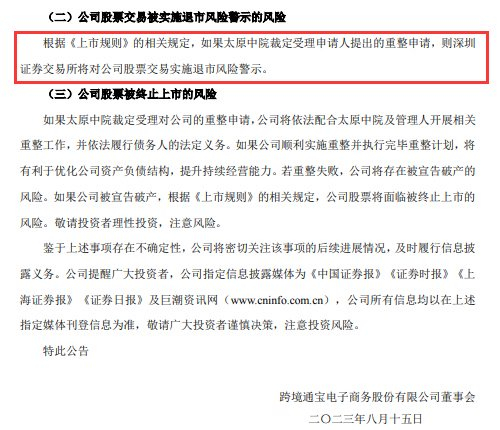 8月16日消息, 跨境通 宝 电子商务 股份有限公司(以下简称跨境通或公司)日前发布关于债权人向法院申请公司重整及预重整的进展公告(以下简称公告)。