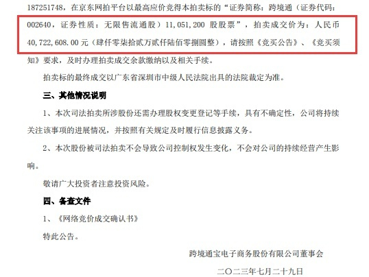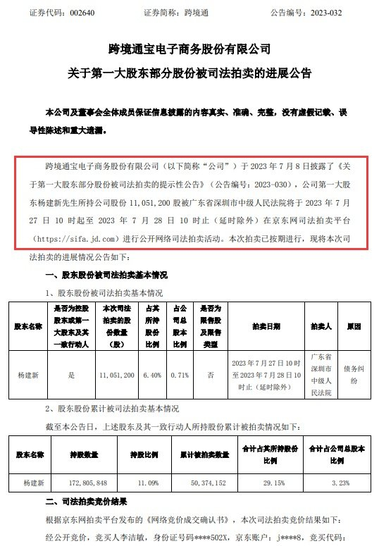 跨境通近日还发布关于第一大股东部分股份被司法拍卖的进展公告,公司于2023年7月8日披露了《关于第一大股东部分股份被司法拍卖的提示性公告》,公司第一大股东杨建新先生所持公司股份11,051,200股被广东省深圳市中级人民法院将于2023年7月27日10时起至2023年7月28日10时止(延时除外)在京东网司法拍卖平台进行公开网络司法拍卖活动。本次拍卖已按期进行。
