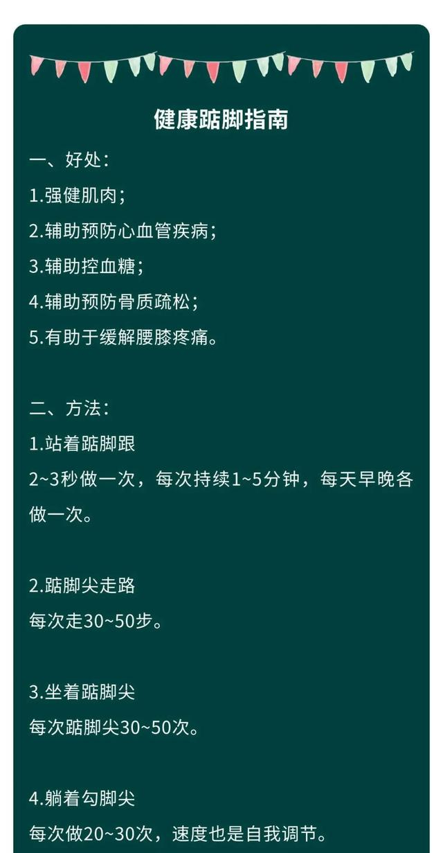 踮脚的频率控制为2~3秒一次,每次持续1~5分钟,感觉脚底微微发热就好,可以每天早晚各做一次。
