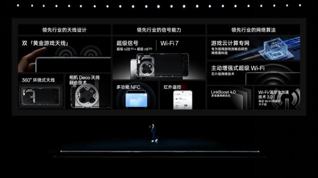 网络方面,一加 Ace 2 Pro 在腰部新增了双黄金游戏天线,手机无论怎么握持,都能保持超强的信号连接。同时,一加 Ace 2 Pro 借助一加自研“低频天线小型化技术”, 将镜头模组区域做成天线,天线能力得到了大幅提升。在行业最常用的N28和N8频段,一加 Ace 2 Pro 将此前的 2 条天线升级为了 4 条,实现了「超级 N28/N8 5G 信号」,带来更快、更稳定的 5G 网络体验。一加 Ace 2 Pro 还全面接入了 Wi-Fi 7 协议,通过多重网络技术专项优化,带来更高速、更稳定、更低延迟和更广覆盖范围的 Wi-Fi 使用体验。在此基础上,一加 Ace 2 Pro 同样支持“主动增强式超级 Wi-Fi”、“LinkBoost 4.0”、“游戏云计算专网”等多项网络技术,在各类场景内都能为用户带来快速、稳定的网络使用体验。