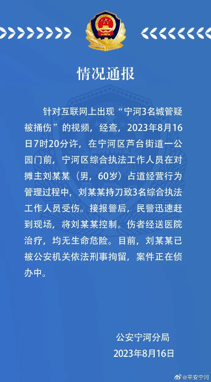 1、警方通报男子持刀致3名综合执法人员受伤 针对网传“宁河3名城管疑被捅伤”,天津市公安局宁河分局16日发布通报称,经查,当日7时20分许,在宁河区芦台街道一公园门前,宁河区综合执法工作人员在对摊主刘某某(男,60岁)占道经营行为管理过程中,刘某某持刀致3名综合执法工作人员受伤。伤者经送医院治疗,均无生命危险。目前,刘某某已被公安机关依法刑事拘留,案件正在侦办中。(@平安宁河)