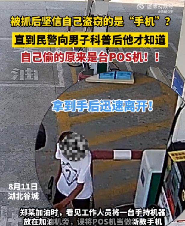 1、男子想偷手机没想到竟偷了个POS机 近日,湖北谷城县公安局五山派出所民警接到辖区内中石化员工报警,称店内POS机被盗。民警通过调查很快就锁定嫌疑人郑某,后在郑某家中将其抓获。原来,郑某去加油时,误将店内POS机当做新款手机盗走,回来之后尚未来得及仔细研究这款“手机”,就被抓获。目前,案件正在进一步侦办中。(@谷城公安)