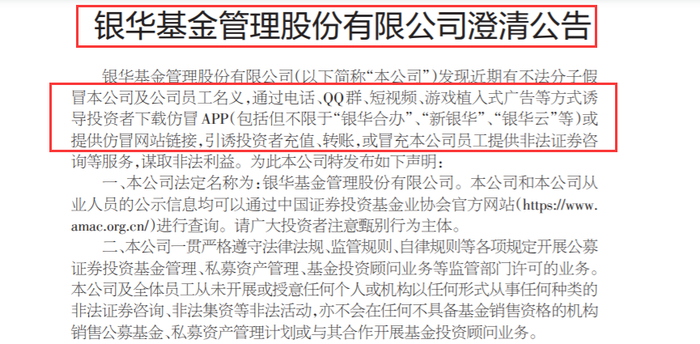 8月16日,银华基金、中航基金、格林基金三家公募同时发布澄清声明,指出有不法分子假冒公司名义开展非法活动,作案渠道包括QQ群、短视频、游戏植入式广告等方式。而这距离银华基金8月9日发布澄清公告,才刚过去一周。