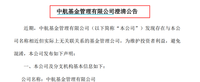 中航基金公告则显示,近期发现存在与中航基金名称相近但实际上无关联关系的基金管理公司。中航基金表示,该公司暂无官方APP,除了上海分公司外没有任何其他分支机构,且从未授权其他任何机构或个人以“中航基金”或分支机构名义开展业务,保留对任何冒用公司名义的机构或人员采取法律行动的权利。