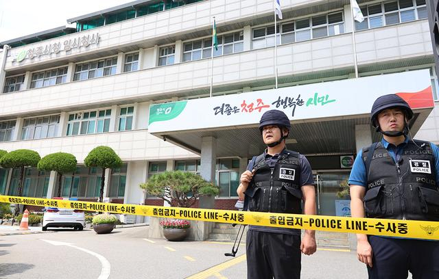 当地时间2023年8月16日,韩国忠州,警察在政府大楼搜查爆炸物,政府工作人员被紧急疏散。