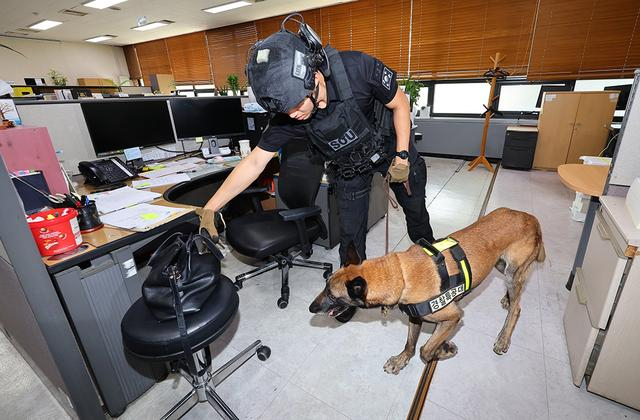 当地时间2023年8月16日,韩国仁川,警察带领嗅探犬在政府大楼搜查爆炸物。