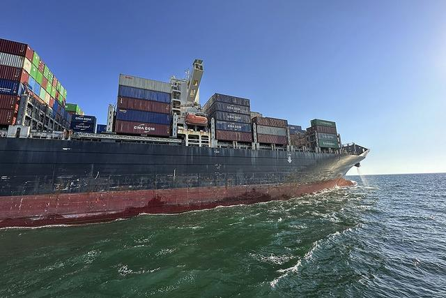 当地时间2023年8月16日,乌克兰敖德萨,集装箱船Joseph Schulte离开敖德萨港,沿着为商船建立的黑海临时走廊行驶。
