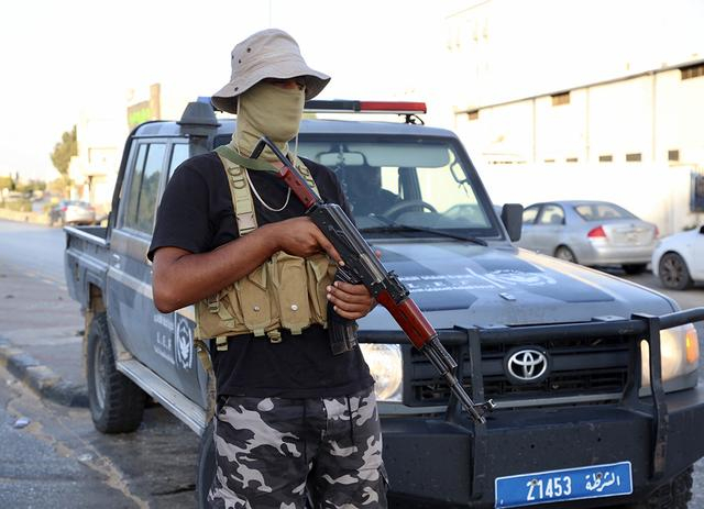 当地时间2023年8月16日,利比亚首都的黎波里,当地发生武装冲突后,安全人员在街道加强警戒。