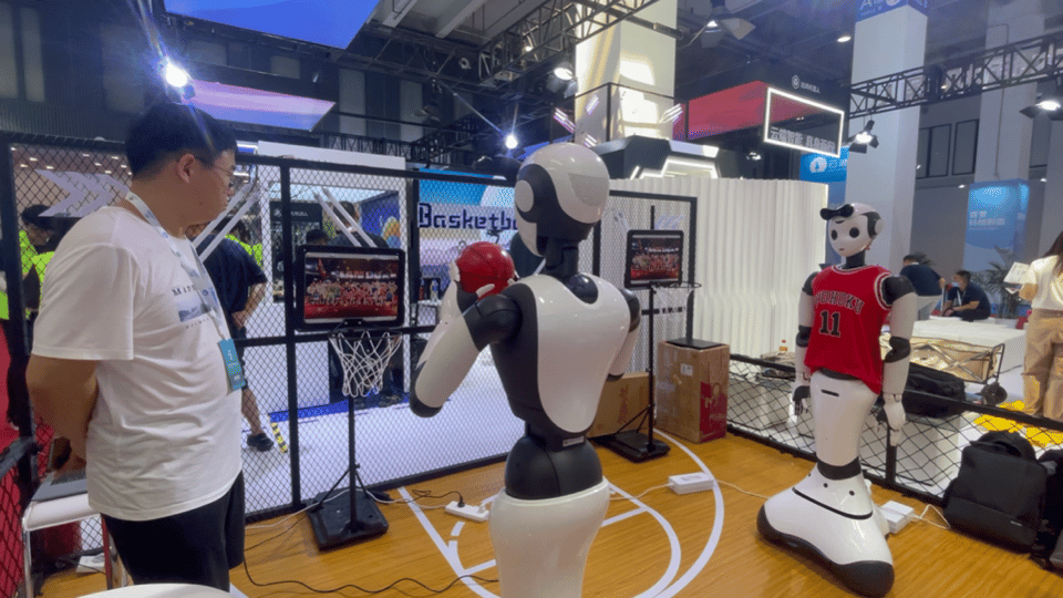 除了给咖啡拉花,记者在现场看到了达闼机器人完成拿起篮球、走到篮筐对应位置,完成投篮的一系列动作。