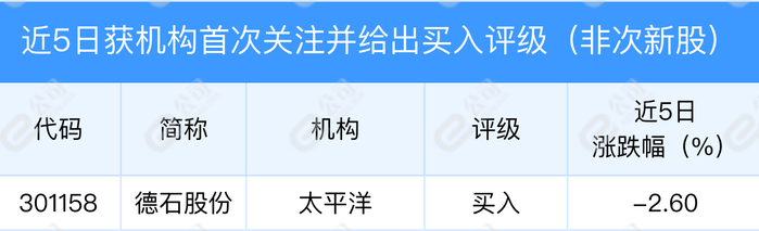 德石股份等在5日内获得机构首次关注并给出买入评级。