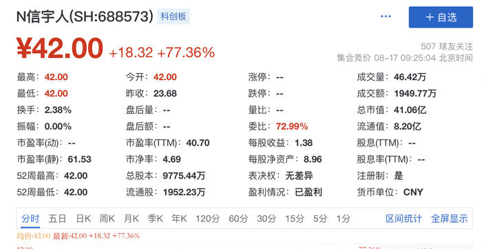 乐居财经 吴文婷8月17日,信宇人登陆上交所科创板,其开盘报42元,涨77.36%,总市值约41.06亿元。