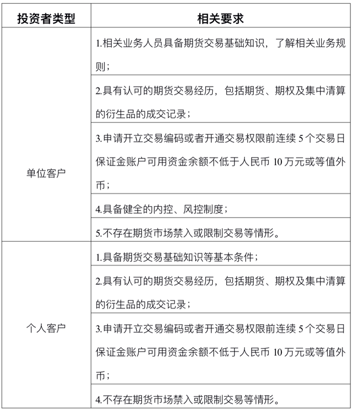 客户参与集运指数(欧线)期货交易的,应当符合《上海国际能源交易中心期货交易者适当性管理细则》的相关规定(如下表所示)。开户机构应当充分使用已了解信息和已有评估结果,已通过适当性评估获得某上市品种交易权限的客户,在同一开户机构可以自动获得集运指数(欧线)期货交易权限。在不同开户机构开户的,可以豁免基础知识、交易经历和资金门槛要求。