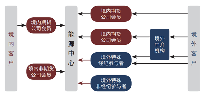 黑色箭头表明交易、结算、交割。红色箭头表明直接入场交易,但境外特殊参与者须通过境内期货公司会员进行结算、交割。