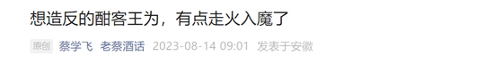 酒类分析师蔡学飞也发文,表示严重“看不起”。“想造反的酣客王为”,真是走火入魔了?
