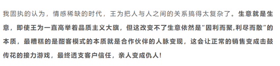 我固执的认为,情感稀缺的时代,王为把人与人之间的关系搞得太复杂了。生意就是生意,即使王为一直高举着品质主义大旗,但这改变不了生意依然是“因利而聚,利尽而散”的本质,最糟糕的是酣客模式的本质就是合作伙伴的人脉变现,这会让正常的销售变成击鼓传花的接力游戏,最终透支客户信任,亲人变成仇人!