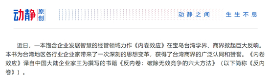 还说,王为通过《反内卷》分享了中国大陆的企业发展思想与发展机遇,以中国民营企业创新实践的方法论,帮助了台湾传统企业进行供给侧改革和产业重做升级,重塑了各行业的企业标准与品牌价值,引领两岸企业冲破“内卷”旧循环。
