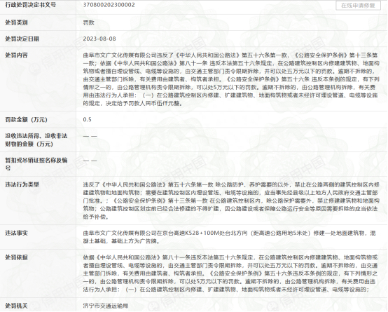 曲阜市文广文化传媒有限公司因违规修建广告牌被罚5000元