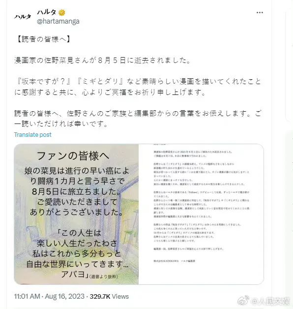 据日本“ORICON NEWS”8月16日报道,角川旗下漫画杂志官方社交媒体账号发布消息,《在下坂本,有何贵干》漫画作者、漫画家佐野菜见于8月5日因癌症去世,年仅36岁。
