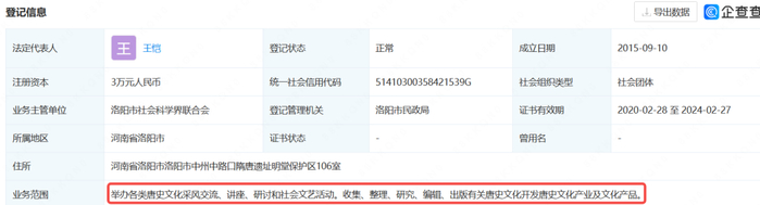 据洛阳市隋唐史学会网站介绍,洛阳市隋唐史学会是经过洛阳市民政局批准的由洛阳市社科联主管的社团组织,统一社会信用代码:51410300358421539G。法人代表为王恺。