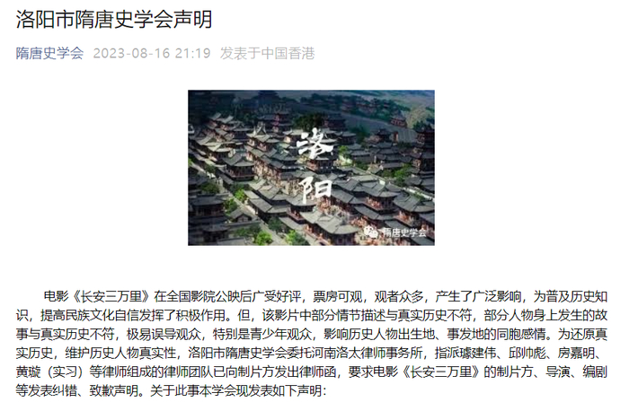 洛阳市隋唐史学会介绍“案件背景”称,电影《长安三万里》自2023年7月8日起在我国内地上映。一经上映,反响强烈,票房猛增。但同时也有专家、学者、普通民众甚至官方媒体通过网络发声,指出影片中与历史不符之处。随着各地网友加入,争论已经升级为骂战。目前该片票房已超17亿,但制片方、导演、编剧等对于网友的质疑、骂战,以及该片与历史不符之处未正面回应。2023年8月12日,洛阳市隋唐史学会委托河南洛太律师事务所处理此事。