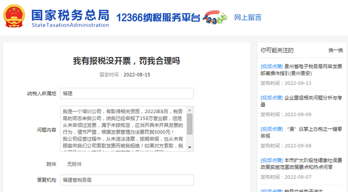 国家税务总局福建省12366纳税服务中心答复: