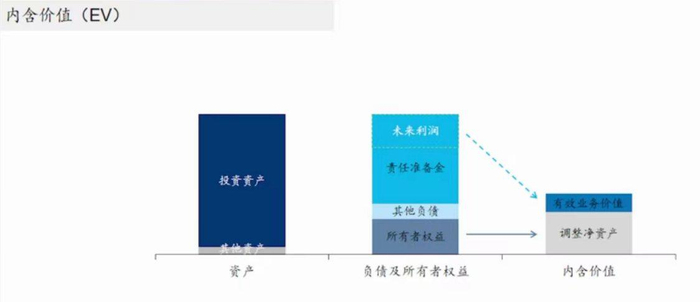 第一个是EV,也就是内含价值,它是由调整净资产和有效业务价值两部分组成。调整净资产就是所有者权益,代表股东拥有的真金白银。而有效业务价值就是未来的利润。因此保险行业通常用P/EV,也就是市值/内含价值进行估值,理论上,这个值是大于1,但实际A股保险大多远远小于1,主要是市场有一些担忧情绪在里面。