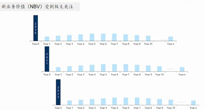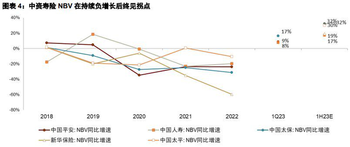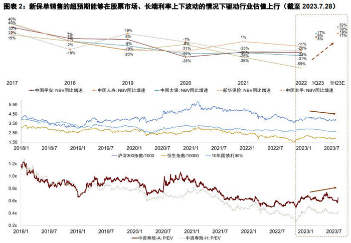 第二个是NBV,新业务价值。这是个投资者非常看重的指标,也就是今年新签保单,在未来能创造价值贴现到现在的结果。这个指标也代表着保险企业基本面的情况。今年以来,寿险企业NBV是持续改善的,不仅同比增速转正,个月甚至还有几十个点的同比增长,比如1-6月,上市险企总保费增速中,太平有10.8%正增长,人保有9.9%的正增长,平安,国寿也分别由8.3%和6.9%个点的正增,这也推动着今年上半年保险行业负债端基本面的改善。