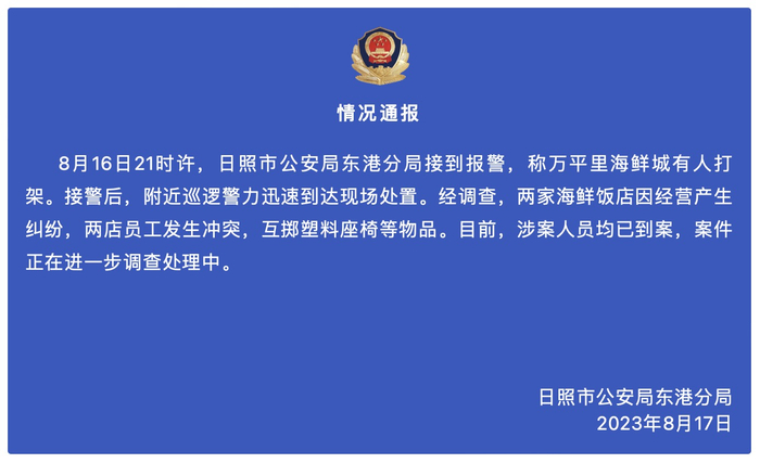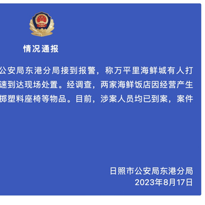 据“东港公安”微信公众号消息,日照市公安局东港分局8月17日发布警情通报,8月16日21时许,日照市公安局东港分局接到报警,称万平里海鲜城有人打架。接警后,附近巡逻警力迅速到达现场处置。经调查,两家海鲜饭店因经营产生纠纷,两店员工发生冲突,互掷塑料座椅等物品。目前,涉案人员均已到案,案件正在进一步调查处理中。