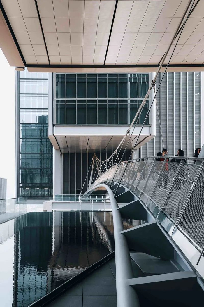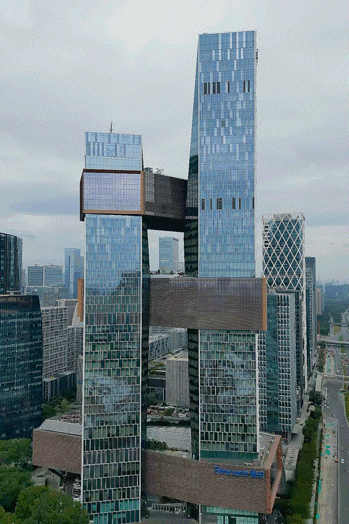 “天空之城”是大疆公司的全球总部基地。两座不对称的超高层塔楼,中间以悬索桥相连接。