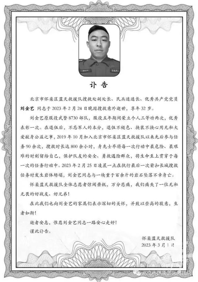今年2月24日晚上,北京怀柔蓝天救援队接到求助,去搜救被困箭扣长城的两名驴友,搜救3个多小时后,次日(25日)凌晨1点多,队员刘金艺在往下搜寻时,遭遇岩体坍塌,不幸牺牲,享年32岁。