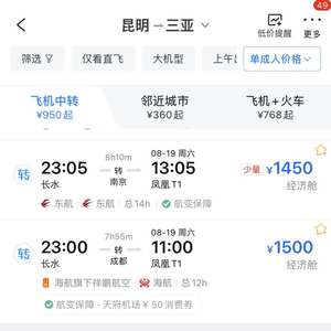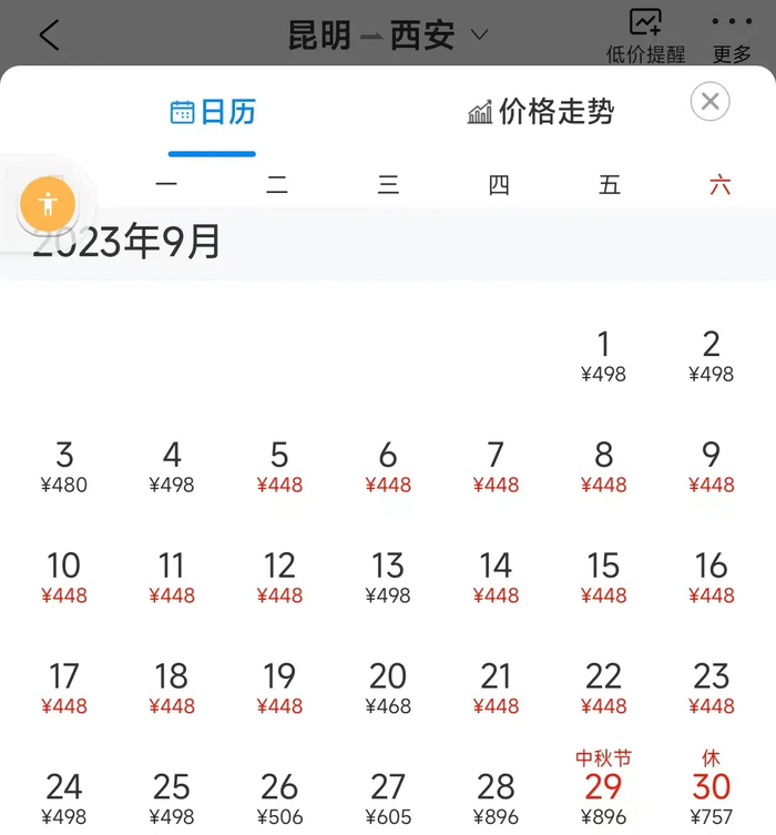 从航线售价情况来看,9月初起昆明飞往三亚、西安、成都等地价格范围集中在400元至600元之间,较8月中旬下降约4成。其中成都8月期间票价达到1400元,节后均价400元,降幅较为明显。另外9月昆明-西安航线最低则稳定在448元,较8月中下旬直接砍半。而9月13日昆明-恩施航线则低至280元。