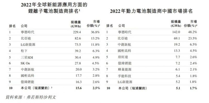 弗若斯特沙利文报告显示,在2022年全球储能电池制造商排名中,瑞浦兰钧以8.8%的市场份额排第3,而在中国动力电池产品中按装机量计拥有1.7%的市场份额,排名第10,在全球新能源应用方面的锂电子电池制造商排名中,该公司也是位列第10。