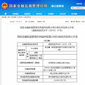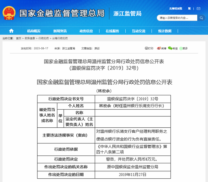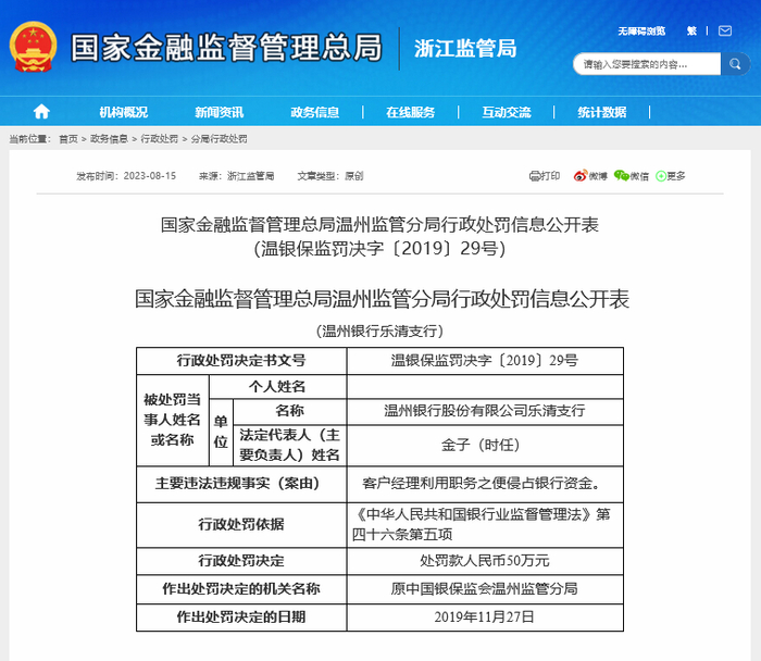 一人伸手累及同僚与单位,温州银行一客户经理因职务侵占被终身禁业,监管时隔近四年公开罚单