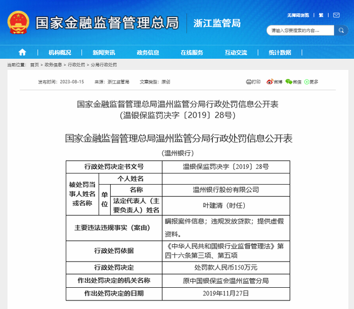 财联社记者注意到,以上6份针对温州银行的罚单,均系原中国银保监会温州监管分局于2019年11月27日发出。以此计,监管此番系时隔近四年后正式向公众公开相关罚单。