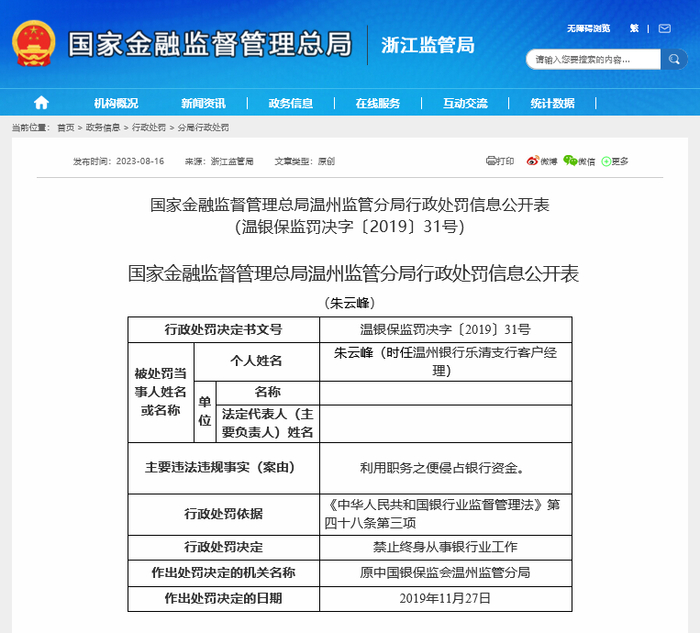8月17日、16日,国家金融监督管理总局官网连续披露多份针对温州银行的罚单,原因均和“客户经理利用职务之便侵占银行资金”有关,而当事人朱云峰(时任温州银行乐清支行客户经理)更被监管部门终身禁业。