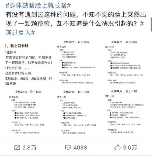 近日,一则关于#身体缺啥脸上就长啥#的话题在网络上引发关注:额头长痘是心火太旺,嘴唇周边长痘是便秘上火,腮边长痘是肝脏受累……总之,脸上长痘痘,不同部位暗示着身体不同的部位出了问题。