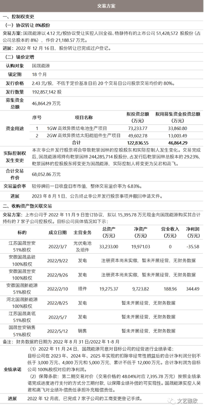 2023年8月1日,乾景园林(603788.SH)公告,鉴于资本市场及相关政策的变化,结合公司实际情况,公司决定终止向收购方锁价定增募集4.69亿元资金事项。乾景园林此次定增为其控制权交易方案的一部分——2022年11月乾景园林公告主营光伏电池和组件生产销售的国晟能源拟通过协议受让上市公司实控人所持上市公司8%股份同时认购上市公司增发股份的方式取得上市公司控制权。