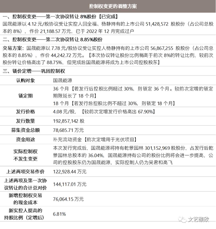 2023年8月9日晚,乾景园林公告了控制权交易的补充方案。在国晟能源已持有8%股份的基础上,其拟以二次协议受让上市公司8.85%股份的方式实现控制权变更,每股价格7.78元,交易作价为4.42亿元,对应上市公司交易市值为49.99亿元,较前次协议转让的交易市值高出88.75%。此次协议转让完成后,国晟能源将直接成为乾景园林的控股股东。同时,上市公司再次向国晟能源锁价定增,与前次定增的发行股数相同为1.93亿股,发行价格为4.08元/股,对应认购资金总价达到7.87亿元,较前次的4.69亿元增加了67.90%。较前次控制权交易方案,修改后的方案(包含第一次协议转让)对应上市公司整体交易市值为39.99亿元,较前次交易市值23.28亿元提高了71.76%;总交易对价增加了7.61亿元,增加的成本来源于二度协议转让8.85%股份对应的4.42亿元及定增发行价格由2.43元/股提高至4.08元/股致使定增总额增加了3.18亿元;新实控人因二度协议转让8.85%股份,在定增发行后其控股比例较前次提高了6.81%,控股比例的提升远不及收购成本的增加。以下为控制权变更的补充方案: