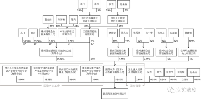 而本次乾景园林的收购主体国晟能源于2022年1月成立,本身无实际经营。且其股东结构穿透至最上层来看,自然人股东主要为国晟能源创始团队及关联方,除自然人以外主要股东的背景为各地国资,包括凤台县国资、淮北市国资、徐州市贾汪区国资。其中上述3大背景的国资产业基金均为私募股权投资基金,系在2022年10月增资入股,法人股东的设立时间也均较短。以下为其股权结构:
