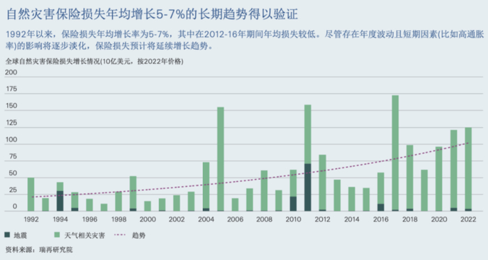据瑞士再保险报告数据显示,2022年,自然灾害给全球经济带来了2750亿美元的损失,其中约45%有保险保障。2022年的保险损失结果再次印证了巨灾损失年均增长5%至7%的长期趋势。