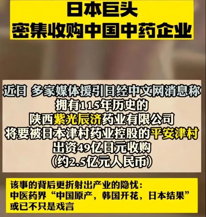 今年4月,有着115年历史的陕西紫光辰济药业,突然被日本汉方药巨头津村以49亿日元(约2.5亿人民币)的价格全资收购。