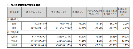 其中,白酒业务实现营业收入81.09亿元,同比去年减少 20.7%。高档酒营收同比减少36.22%,中档酒同比增加4.00%,低档酒同比减少22.71%。白酒业务在总营收中的占比为69.44%,与上一年的68.77%基本持平。
