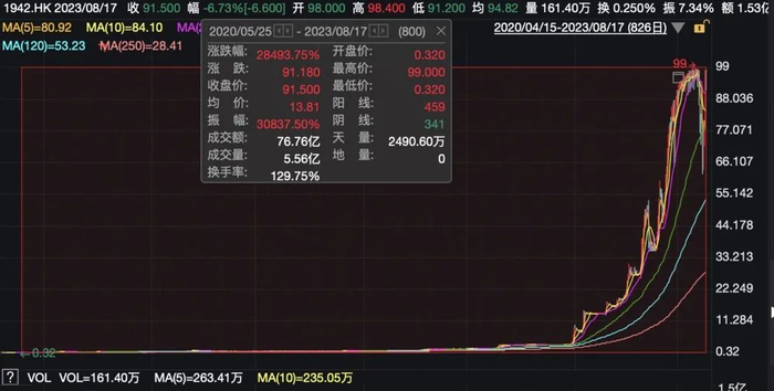 截至8月17日收盘,马可数字科技报收91.5港元,总市值591.85亿港元。而3年前的5月22日,马可数字科技股价最低跌至0.32港元,总市值1.7亿港元。3年多的时间,股价累计涨幅近285倍。