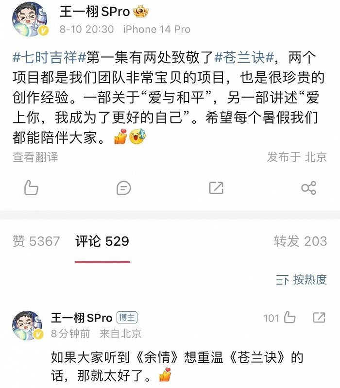 作为暑期档冲刺阶段爱奇艺拿出的S+剧,无论平台还是出品公司恒星引力,都有意复刻去年的《苍兰诀》,剧中BGM还套用了《苍兰诀》的配乐《余情》。尤其是恒星引力方面,创始人王一栩作为制片人亲自发博制造话题“第一集有两处致敬了苍兰诀”。